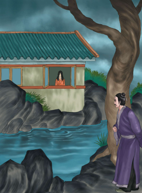 44. 一位姓稣的年轻书生受雇于主家做家教先生,住在主人家一处外院宅子里,房前有一片水塘,水塘对岸有一处房屋,窗子时常开着。一天傍晚,稣先生无意瞥见对面房屋靠窗站着一位女子,乌黑的发髻,长长的发辫,面容十分娇美,只是穿戴的样式看起来比较古旧。稣先生感觉很可疑,这么偏僻的地方怎么会有一个女子居住在此呢?