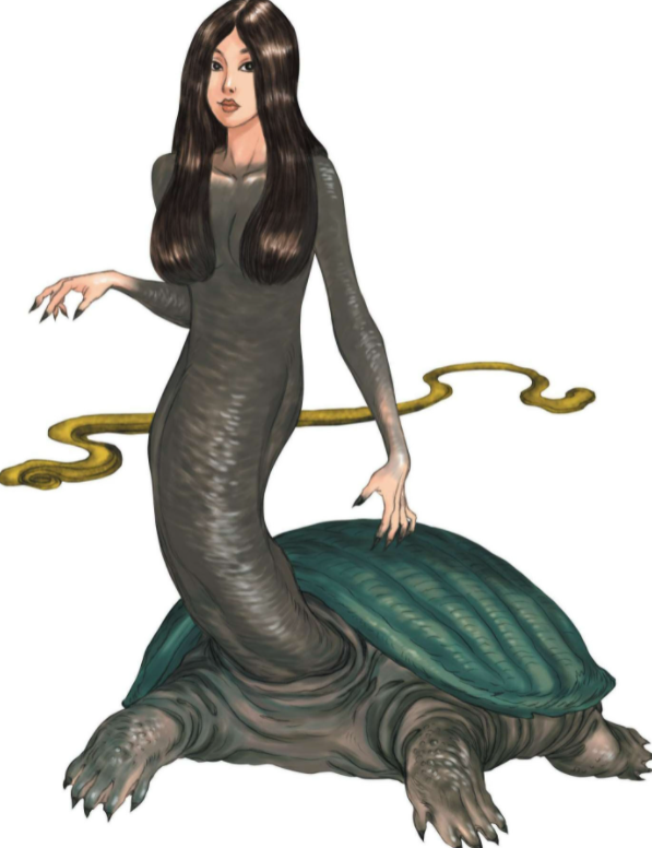 美女的面容和上身,乌黑的长发,只把上身露在窗外,观望着人间美景;下身是一只鳖身,四脚一尾,背负鳖壳,美女的上身长在鳖的脖子上,一旦被人发现全貌,则入水逃走。