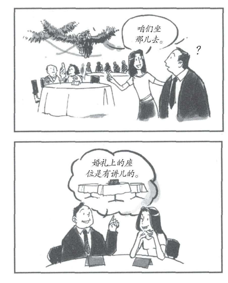 我说:“你可别小瞧这种场面的座次的安排,这里的学问大了。不光是婚礼,所有礼节性的宴会和活动,排座儿和就座儿,都有讲儿,不能乱坐。”
