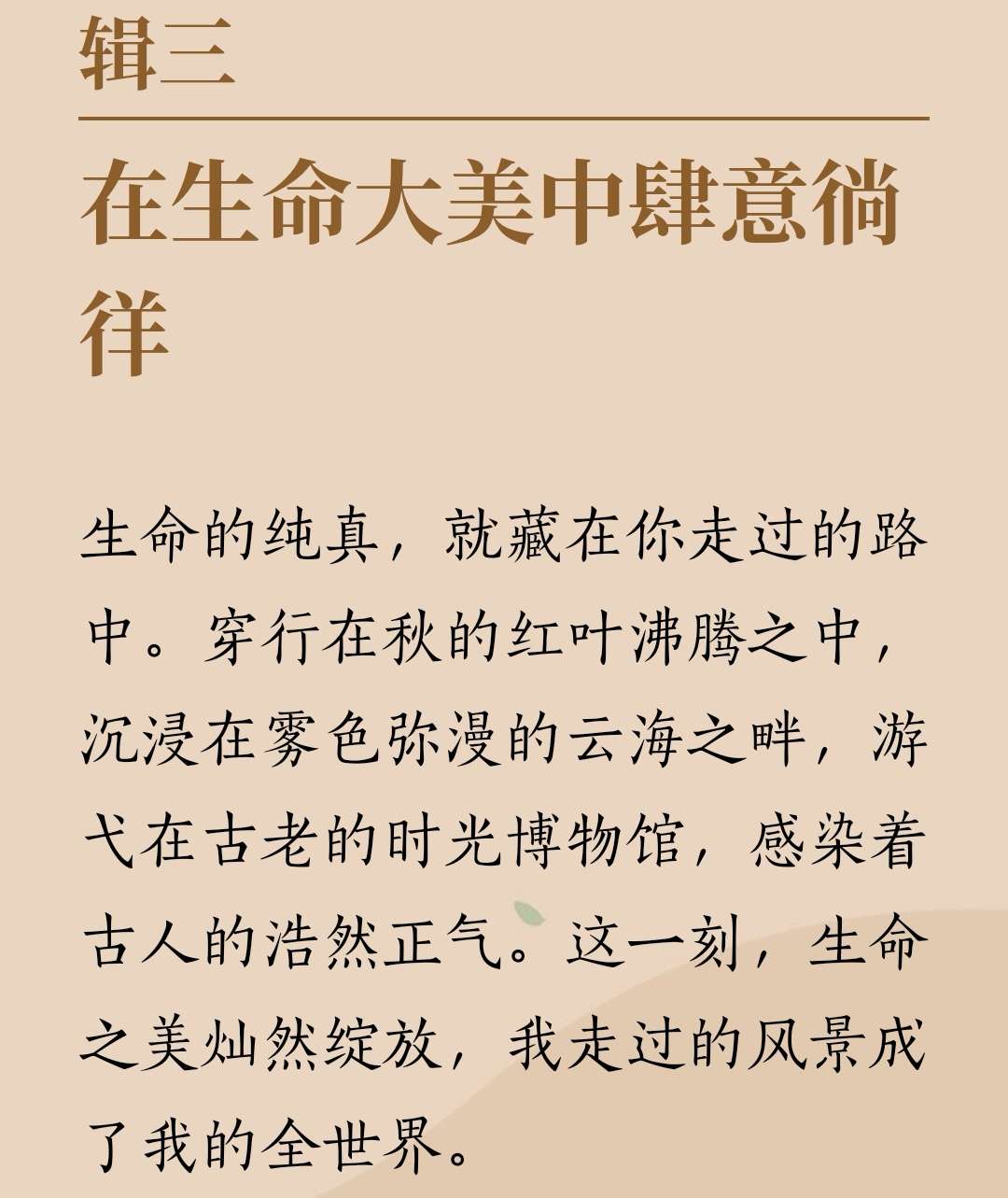 我混在它们中间。我,一个沿着天山行走的旅人。我在高耸的雪峰之下。我在戈壁上。哦,请把你的花环佩戴给我!这太阳的仪仗队,一个戈壁小学的一百万个孩子,站在砾石上,听着流响的雪水,迎着有些寒冷的晨风,从大漠上赶来欢迎我。