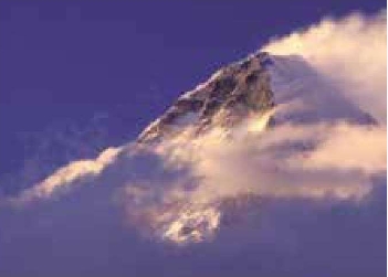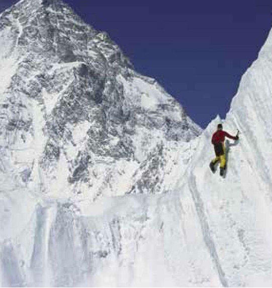 背上你的照相机,沿着陡峭的山坡,一边用冰镐bīng gǎo挖出落脚的坑,一边用手支撑着坡面,一路下到谷底。在乱石累累的山坡上寻找前进的道路,你会看到乱石之中有很多绑着黄丝带的石头,这都是登山运动员摆在那里,作为路标参考用的。