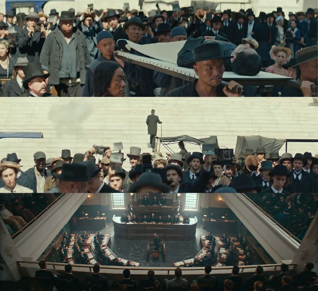 白轩龄:但是这张最著名的竣工合影上。为什么没有一个华人的身影?是我们不配吗?…先生们。我请你们看看脚下的大理石地板。…这些椅子、桌子、以及这富丽堂皇的穹顶。全部出自,被你们的傲慢!偏见!!歧视所伤害的华人之手。此刻。我的独子,正曝尸室外。他生在美国!!我们父子!为这个国家付出了年华和生命!!可我们最终得到了什么?!!得到的终是一纸,没有询问过任何华人的排华法案!你们说我们是洞中的老鼠!我相信在座的各位,无人不受利于老鼠的劳动。你们的食物从哪儿来!衣服、房子、甚至交通!!在这片土地上。在那些土著眼里。我们,都是外来者。人人生而平等,是美国的独立精神、立国之本。先生们,我只想问最后一句。平等,在哪里?!