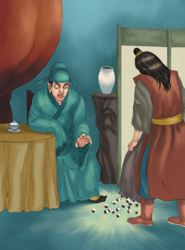 一个十四五岁的少年公子,文质彬彬地提着布袋;他面带笑容,从容倒出口袋里的东西,哗啦啦上千只眼珠子四处乱滚。