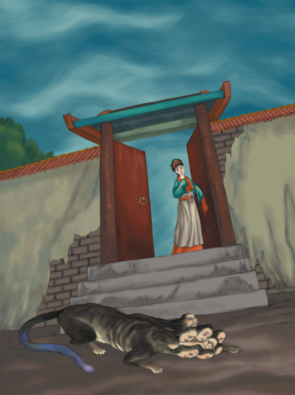 它被发现时就已经死了,也许只是表象。狗的身体上生有九个脑袋,却长着拳头一样的脸;九张人脸相貌各异;尾巴的长度超出一般狗尾,生有五色毛。