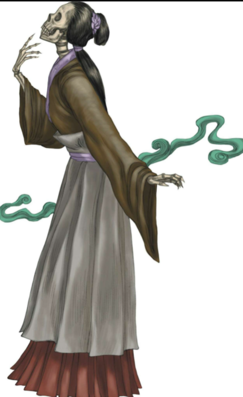 明吴承恩《西游记·二十七回·尸魔三戏唐三藏 圣僧恨逐美猴王》:“果然这山上有一个妖精,孙大圣去时,惊动那怪。他在云端里,踏着阴风,看见长老坐在地下,就不胜欢喜道:‘造化,造化!……等我且戏他戏,看怎么说。’……行者道:‘他是个潜灵作怪的僵尸,在此迷人败本,被我打杀,他就现了本相。他那脊梁上有一行字,叫做白骨夫人。”