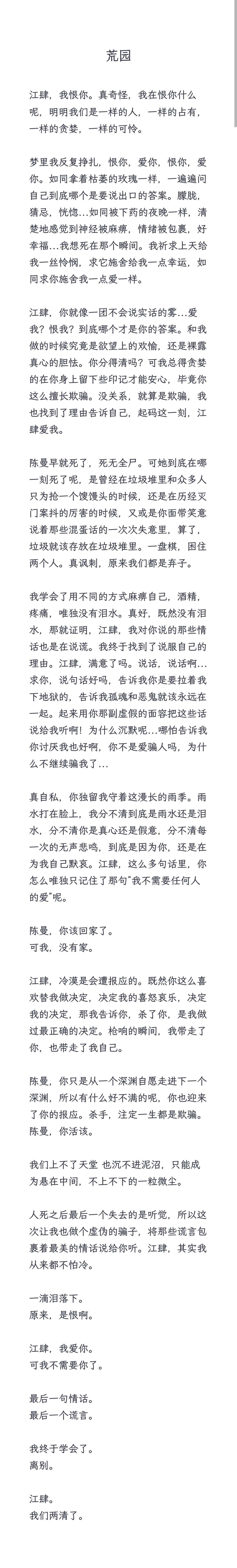 江肆:(混响)阿曼,对不起,恨我吧。恨我者得永生,爱我者共腐朽。你的灵魂不该同我一起烂在泥里。我错了,错得离谱,我不该折断你脊骨的。