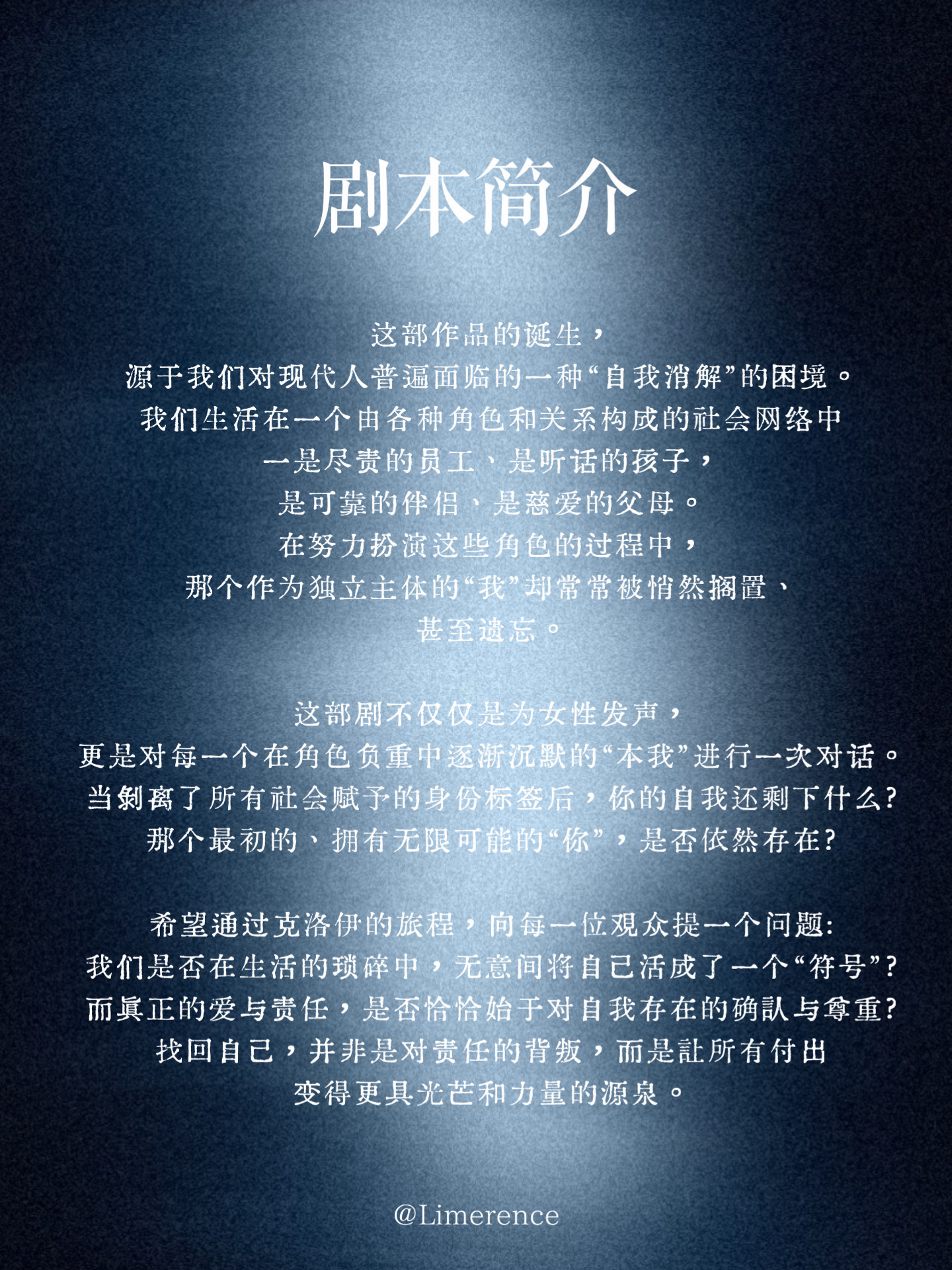 克洛伊:(躺在地上)我究竟是谁?我究竟是谁?是一个好妻子?一个好妈妈?一个拥有独立思想的女人?还是一个身材没有走样的年轻女孩?我不知道。我不知道我自己到底是谁?我应该...是我自己。我应该像一朵娇艳的花朵,肆意张扬的生长,疯狂的生长!而不是像现在这样,变成一头蠢笨如猪的大象,被困在房子里,困在家里,困在婚姻里!我应该走出去!我应该...我应该找找自己的心!