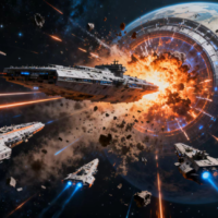 (人类城市的摩天大楼群的影像在旗舰上方的太空中显现)