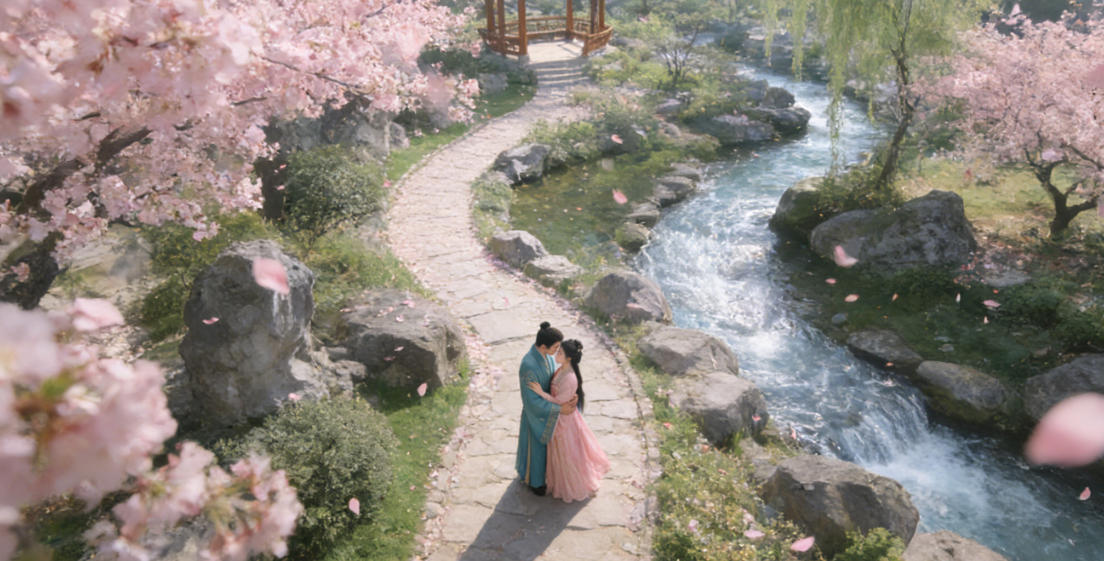 花园里,蒋祯拥着苏瑶卿,月光洒在两人身上,纯白的醉仙颜花瓣缓缓飘落,落在他们交握的手上,晚风拂过花海,传来细微的花语声……