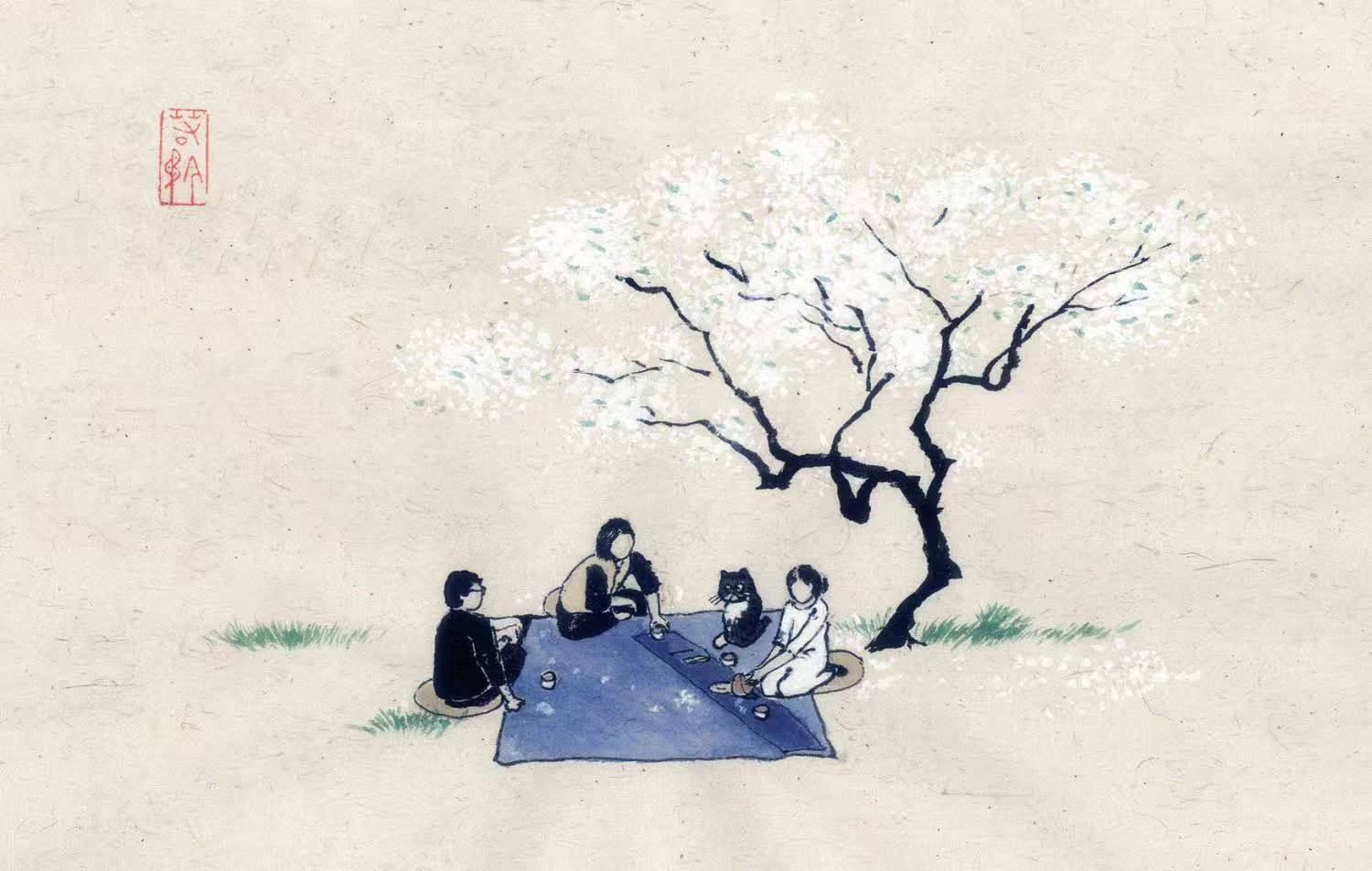 ○茈碧湖的梨花茶席(去大理茈碧湖看梨花那天,小猫踏踏当然没有跟着一起来。现在,踏踏已经不在人间了,所以把踏踏邀请到我画中来,和春分日那天的我们,一起在梨花雨下喝一杯茶)