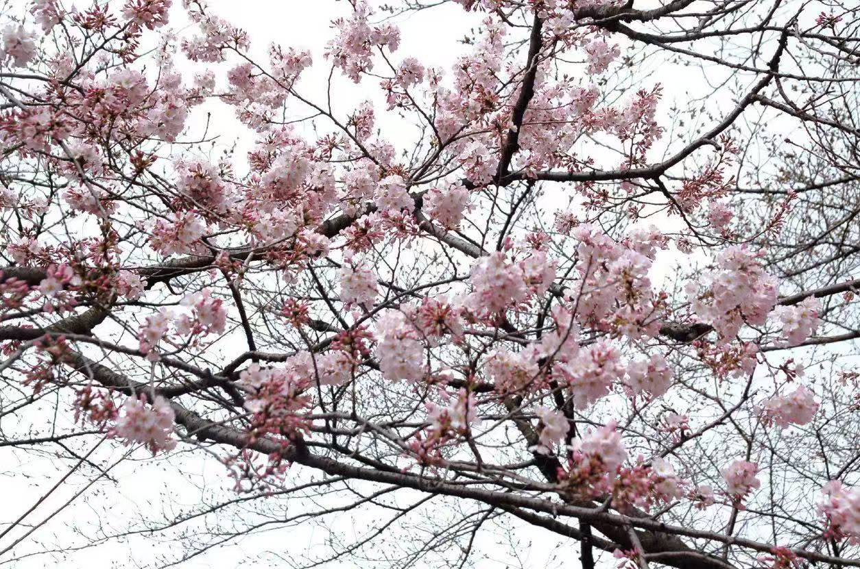 在大多数樱花还睡眼惺忪时,倒是有几朵急性子的花朵,已然全开。这样的樱花树,远远看去,那淡淡的粉,便是“遥看近却无”的。走在夹道尽是樱花树的大道上,头顶仿佛笼着淡粉的烟霞。偶然见到已经绽放的几树,则在烟霞中层层晕染出绚烂的粉白。