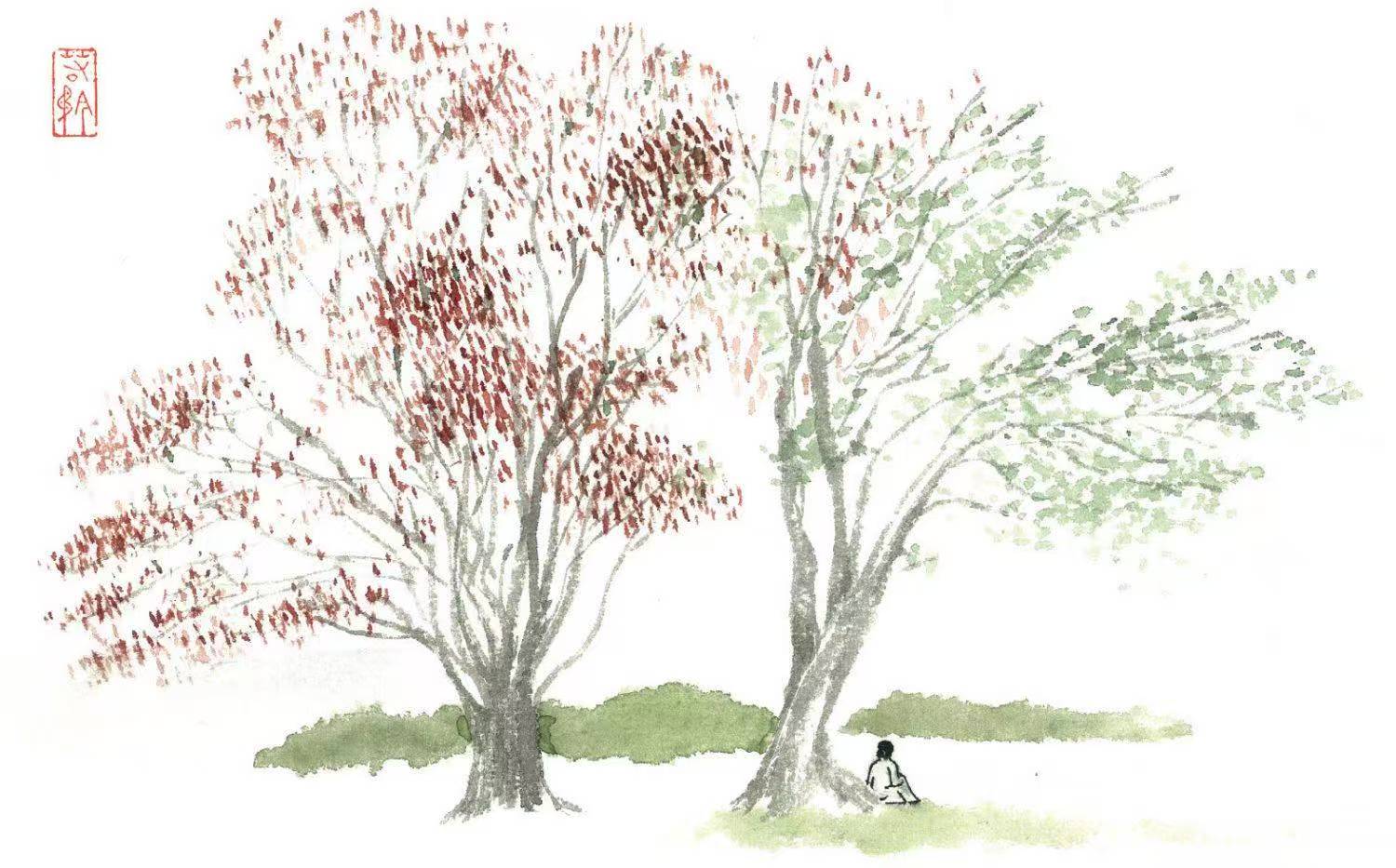 后来文一对我说,每年冬天,大叶榕树叶子都会落光,只剩下枯树枝丫。待到春日,空气里刚刚萌生春天的气息,大树向阳的一面,就会结出笔挺挺的红色叶芽。待到春意再深一点儿,向阳面的红色叶芽便爆开来,舒展出绿色的叶子,背阳一面的枯枝,则刚刚才苏醒,结出红色叶芽,那时满树冠便是一半的红,一半的绿。临近暮春,背阳面的红叶芽也绽开绿色的叶子,直到盛夏,便是满树翠帷wéi了。