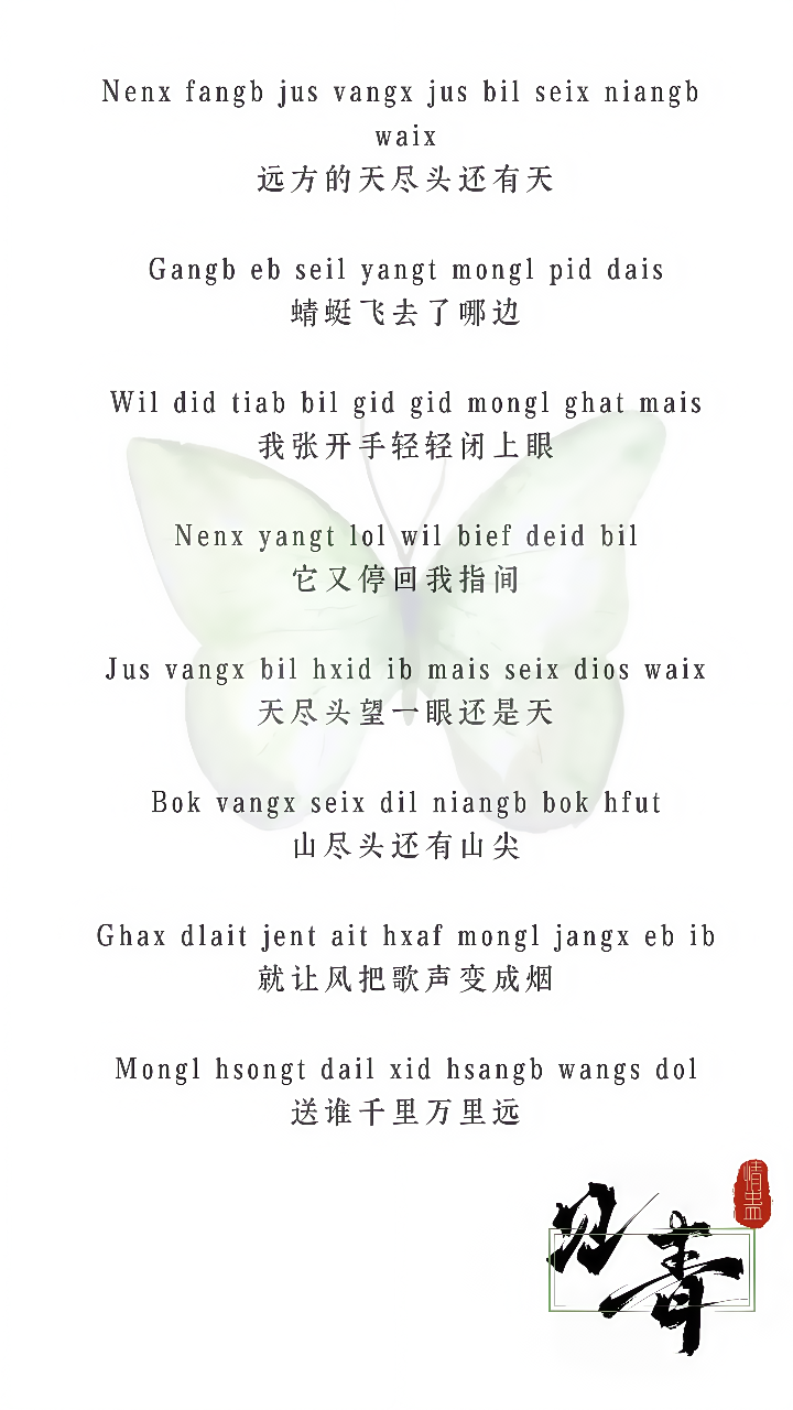 阿青:(苗语,平静)外人不得入寨。(苗语音译:德列 阿嘎布豪摘)