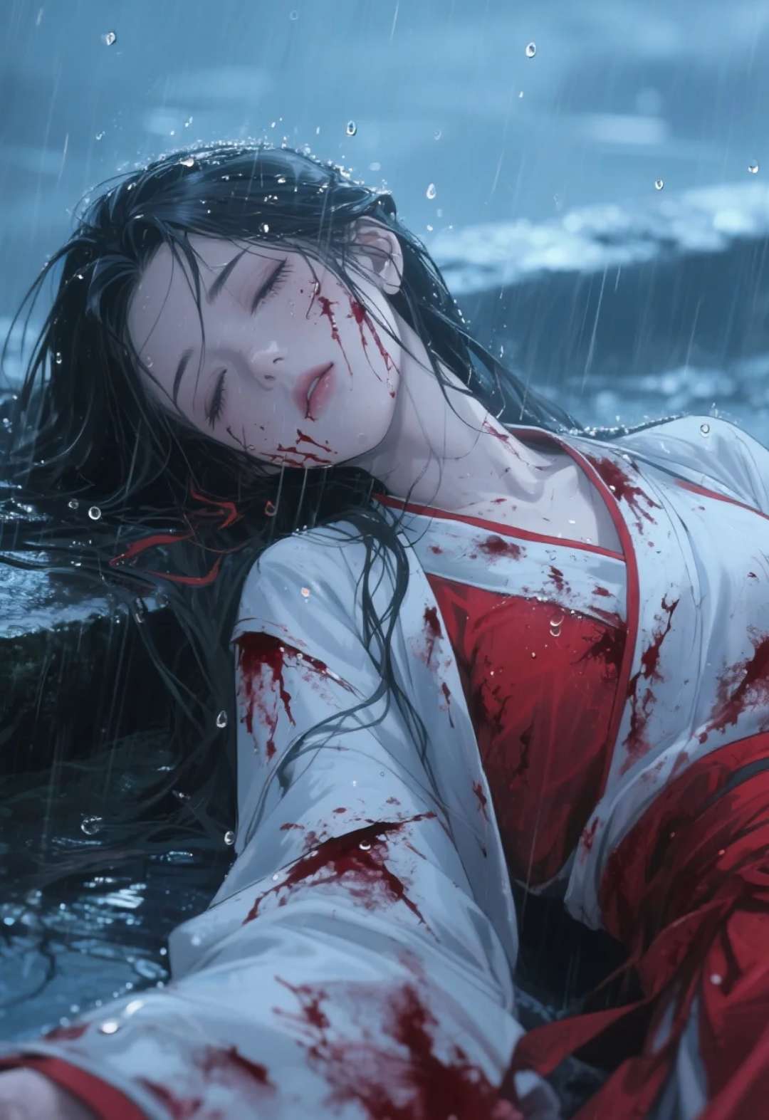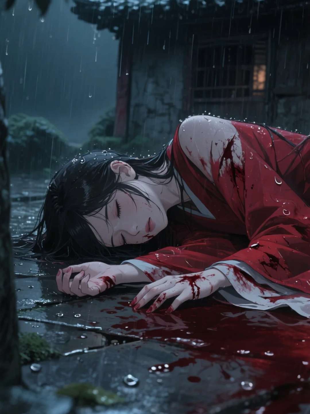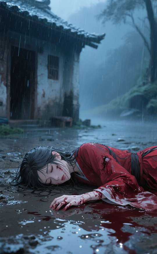 音效:雨声,推开门吱呀声,血腥味仿佛能透过声音传来