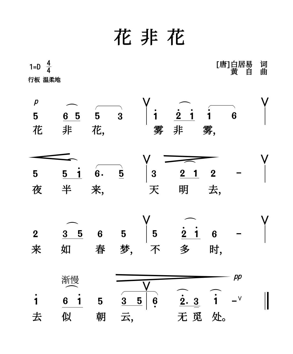 《花非花》是唐(中唐)代诗人白居易创作的一首杂言古诗(也可看作是一首词)。此诗表达了对人生如梦幻泡影,如雾亦如电的感慨,表现出一种对于生活中存在过,而又消逝了的美好的人与物的追念、惋惜之情。全诗由一连串的比喻构成,描述隐晦而又真实,朦胧中又有节律整饬与错综之美,是情诗中的佳作。同时,全诗语意双关,雾、春梦、朝云这几个意象都是朦胧缥缈的,意象之间又有意省略了衔接,显现出较大的跳跃性,文字空灵精练,使人咀嚼不尽。后人曾将此诗谱为曲子,广为流传。