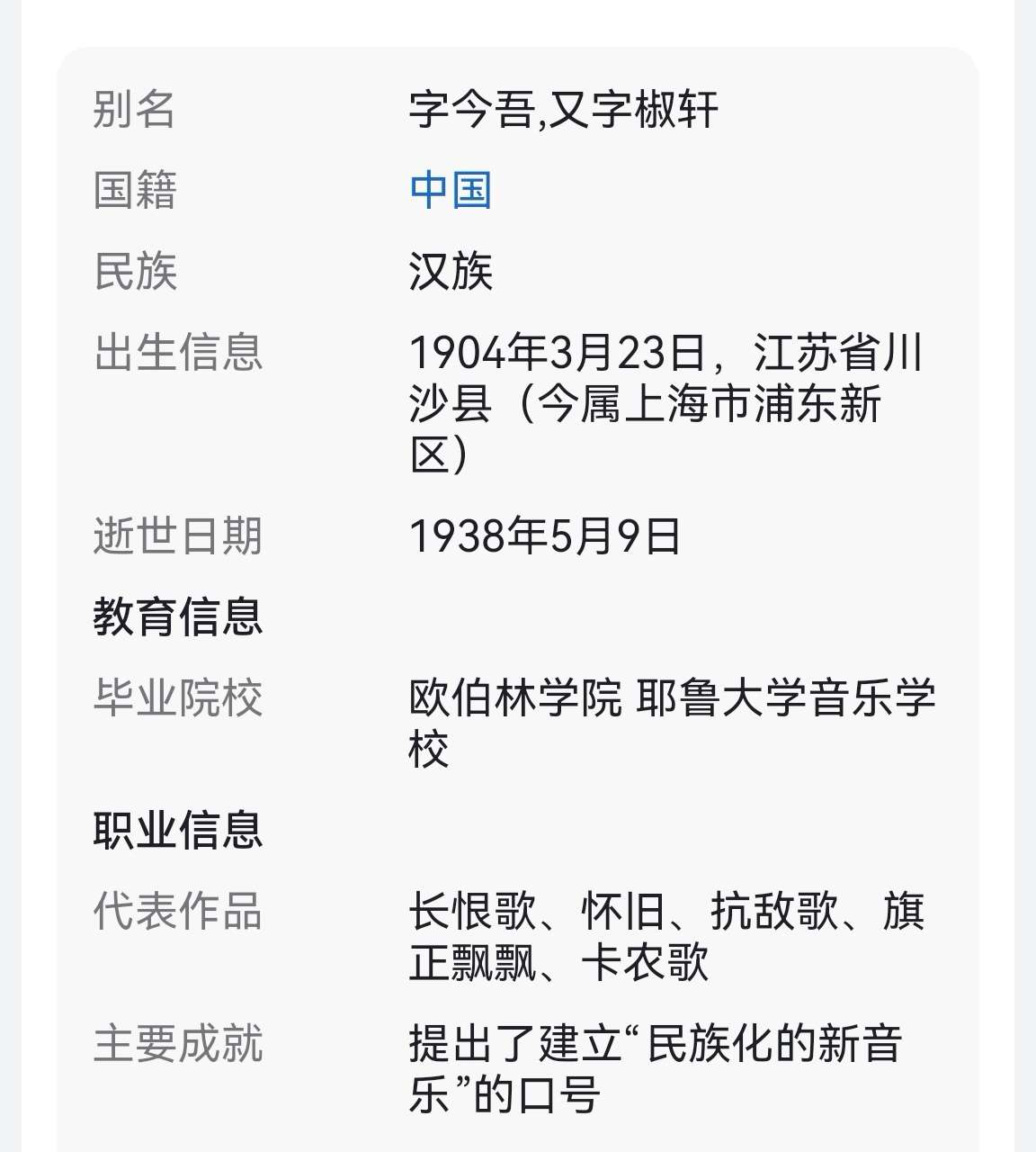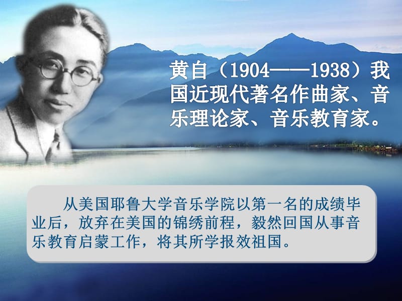 黄自(1904年3月23日~1938年5月9日),字今吾,江苏省川沙县(今属上海市浦东新区)人。是中国30年代重要作曲家,音乐教育家,早年在美国欧伯林学院及耶鲁大学音乐学校学习作曲。1929年回国,先后在上海沪江大学音乐系、国立音专理论作曲组任教,并兼任音专教务主任,热心音乐教育事业,培养了许多优秀音乐人才。黄自是中国早期音乐教育影响最大的奠基人。