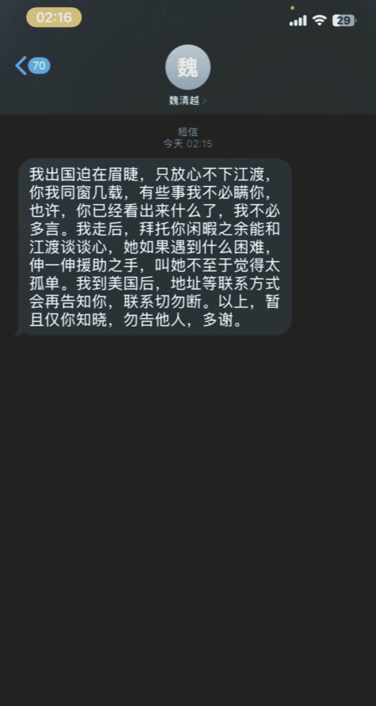 魏清越:(混响)我出国迫在眉睫,只放心不下江渡,你我同窗几载,有些事我不必瞒你,也许,你已经看出来什么了,我不必多言。我走后,拜托你闲暇之余能和江渡谈谈心,她如果遇到什么困难,伸一伸援助之手,叫她不至于觉得太孤单。我到美国后,地址等联系方式会再告知你,联系切勿断。以上,暂且仅你知晓,勿告他人,多谢。