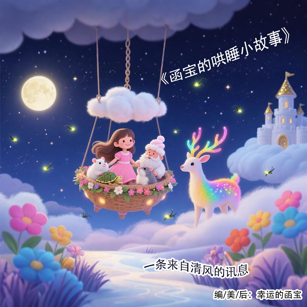云朵城堡里的棉花糖国王说,他听彩虹山谷的蒲公英讲,有个叫函宝的小姑娘,笑声像风铃一样,每天都快快乐乐的,她还有个七彩小鹿朋友,凡是小鹿的蹄子踏过的地方,都会开出带珍珠的七色花。所以他特别邀请你们,去云朵城堡的月光剧场一起唱首歌。“