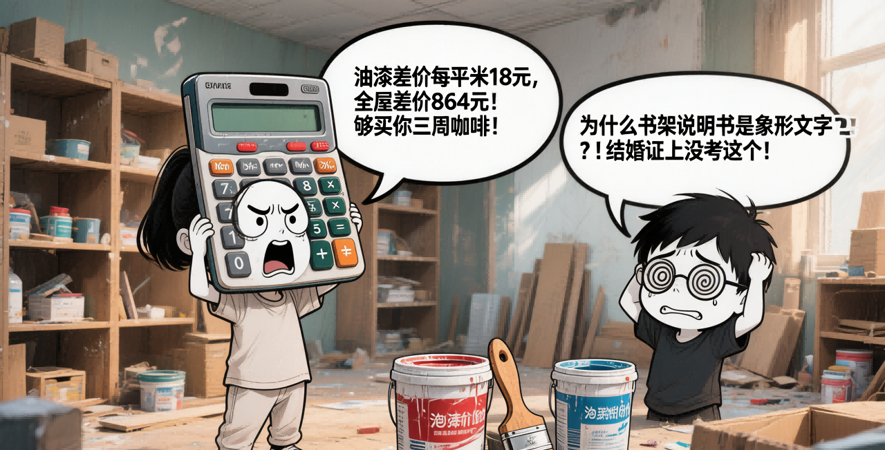 旁白:林薇举着油漆色卡,头发沾着白灰。陈卓在组装宜家书架,螺丝刀滑手骂了句脏话。