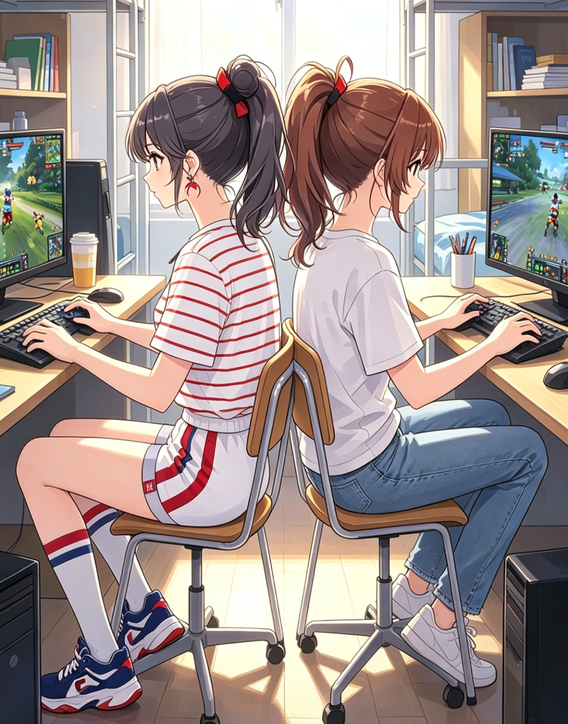 (于朵朵推门进来,一眼看到坐在办公桌后的闻过睦。闻过睦抬起头,看到一个身穿运动夹克、运动裤和滑板鞋的女孩探头进来,眨了眨眼睛)