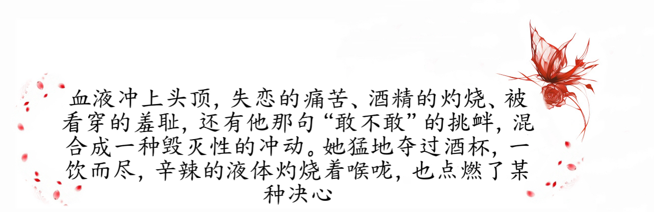K:(逼近一步)远点?(笑)那为什么…你在发抖?(指尖若有若无划过她发烫的手臂)酒精可烧不出这温度,宝贝儿。这是…别的火。想让它…烧得更旺?(气息拂过她耳畔)还是…让我帮你…浇灭它?