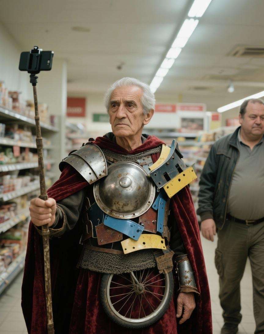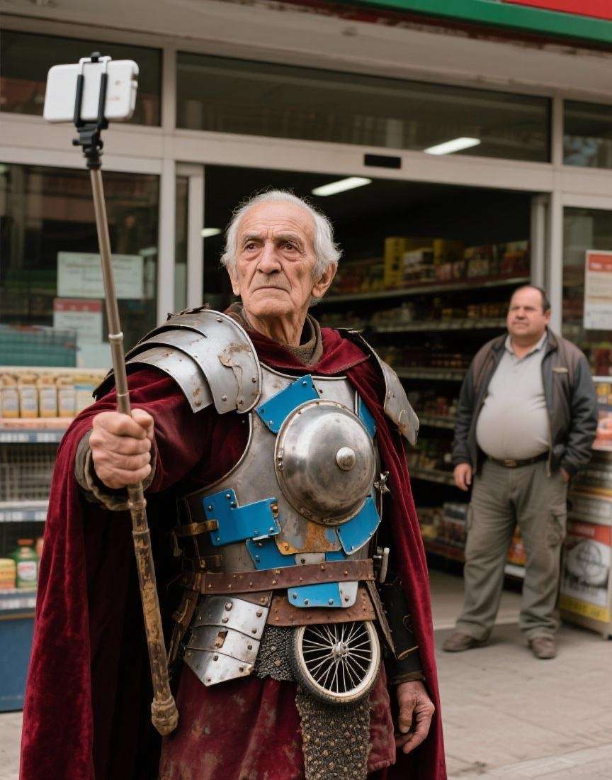 旁白:他挺起了自拍杆,迈着蹒跚却故作威武的步伐,向着超市自动门走去……