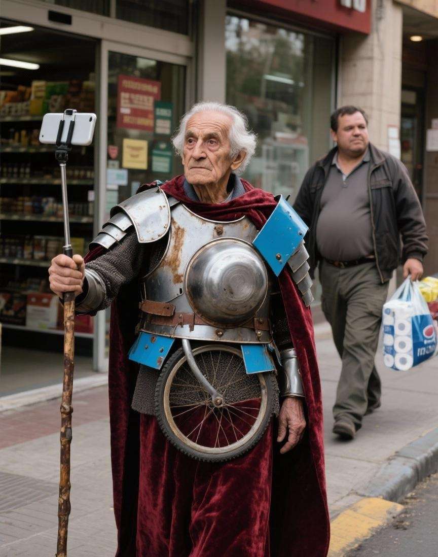 阿隆索·吉哈诺:去吧,潘沙。去买你的卫生纸。也许你说得对,日子总要过。骑士的冲锋……可能改变不了风车,但至少,(他摸了摸身边的旧自拍杆)让这旋转的世界,有了一个不太一样的故事……