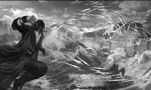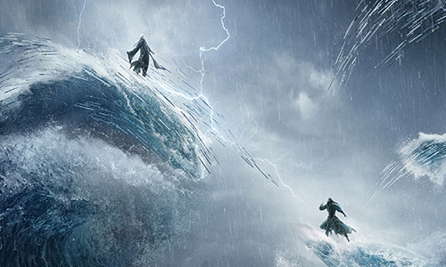 瞬间挥动巨翻海啸 将巨剑拦下 巨剑冲刺在海浪中