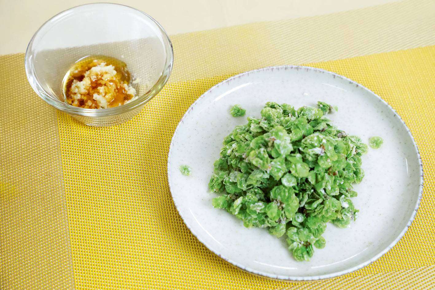 第二道臣菜,我们根据北方的时令,推荐蒸榆钱。榆钱是榆树的果实,像豆荚一样,一个包一个,挂在树上,熟了以后变得轻盈、焦黄,然后随风飞舞播种。我们在它青的时候,还没完全熟的时候就撸下来,一串一串的。不打农药或没有污染的榆钱,直接撸下来放在嘴里就可以吃,它本身就很香、很甜。