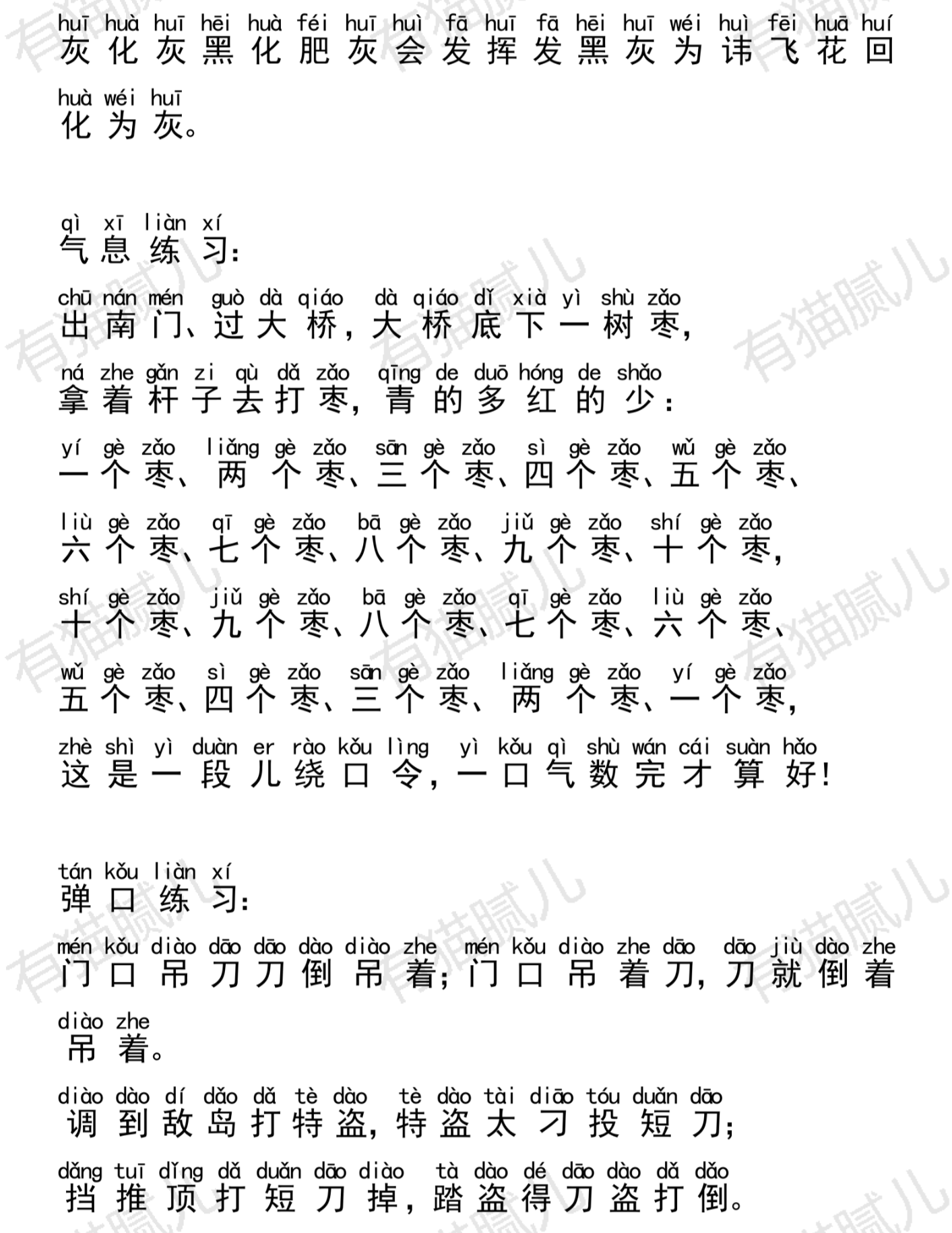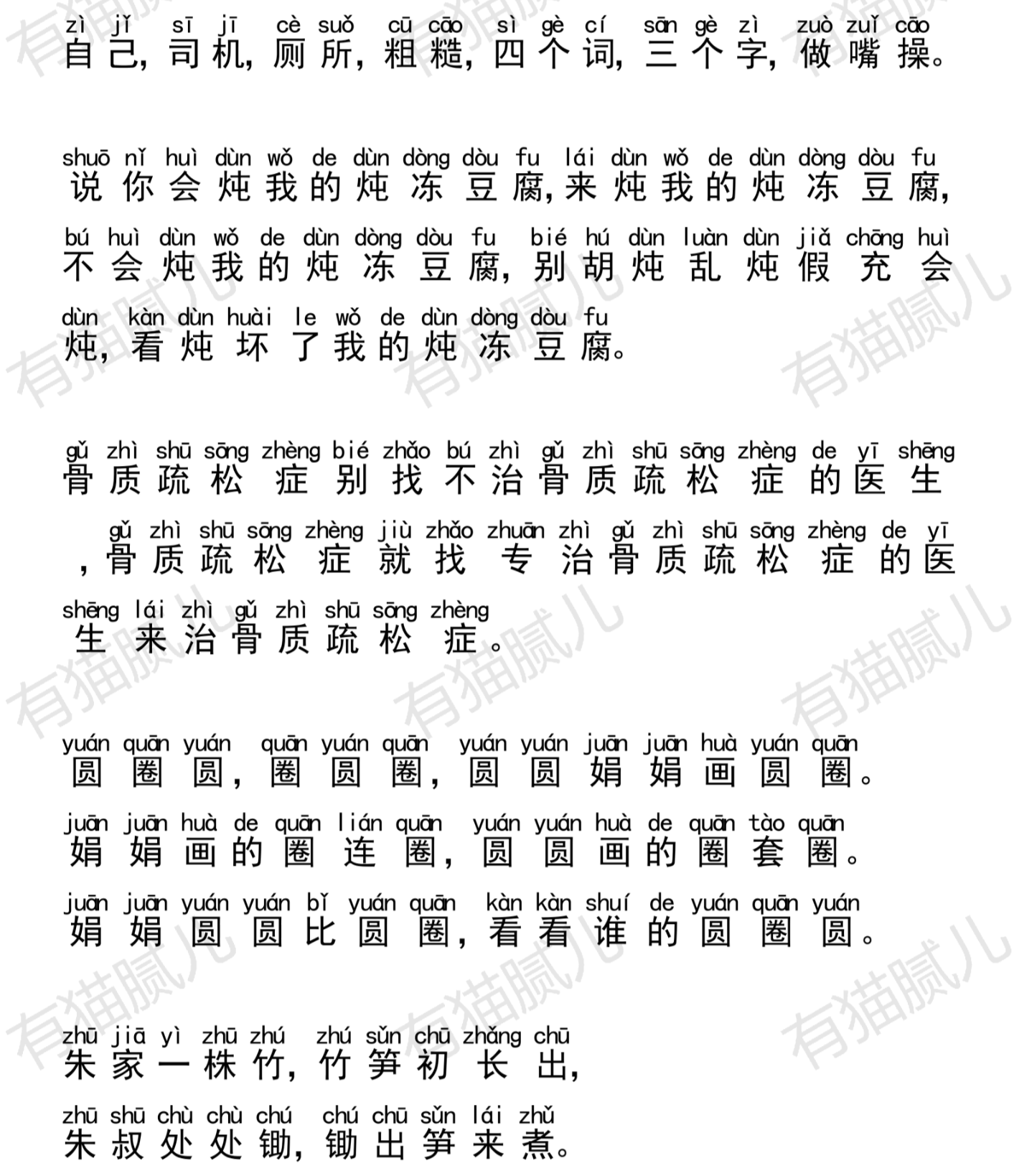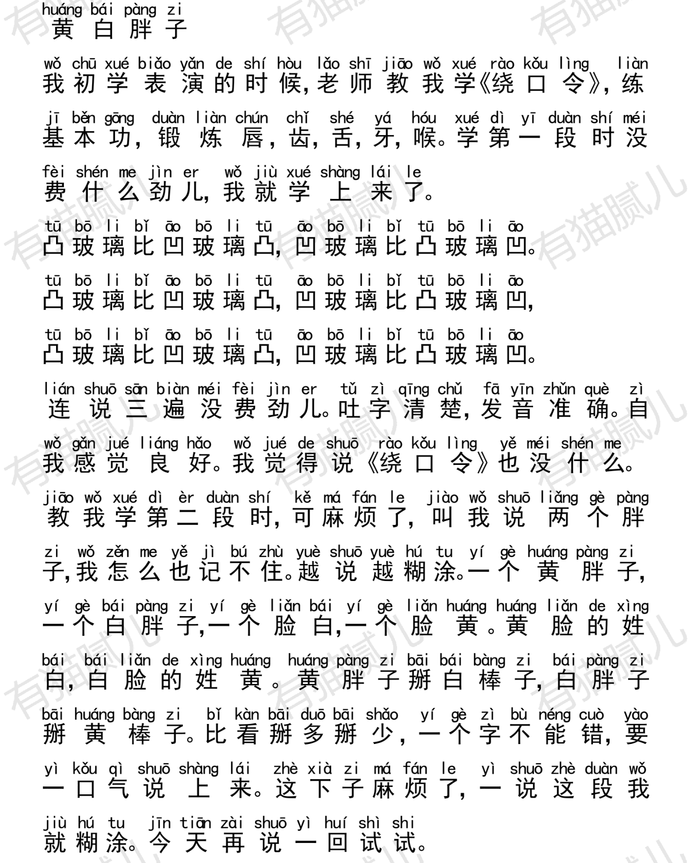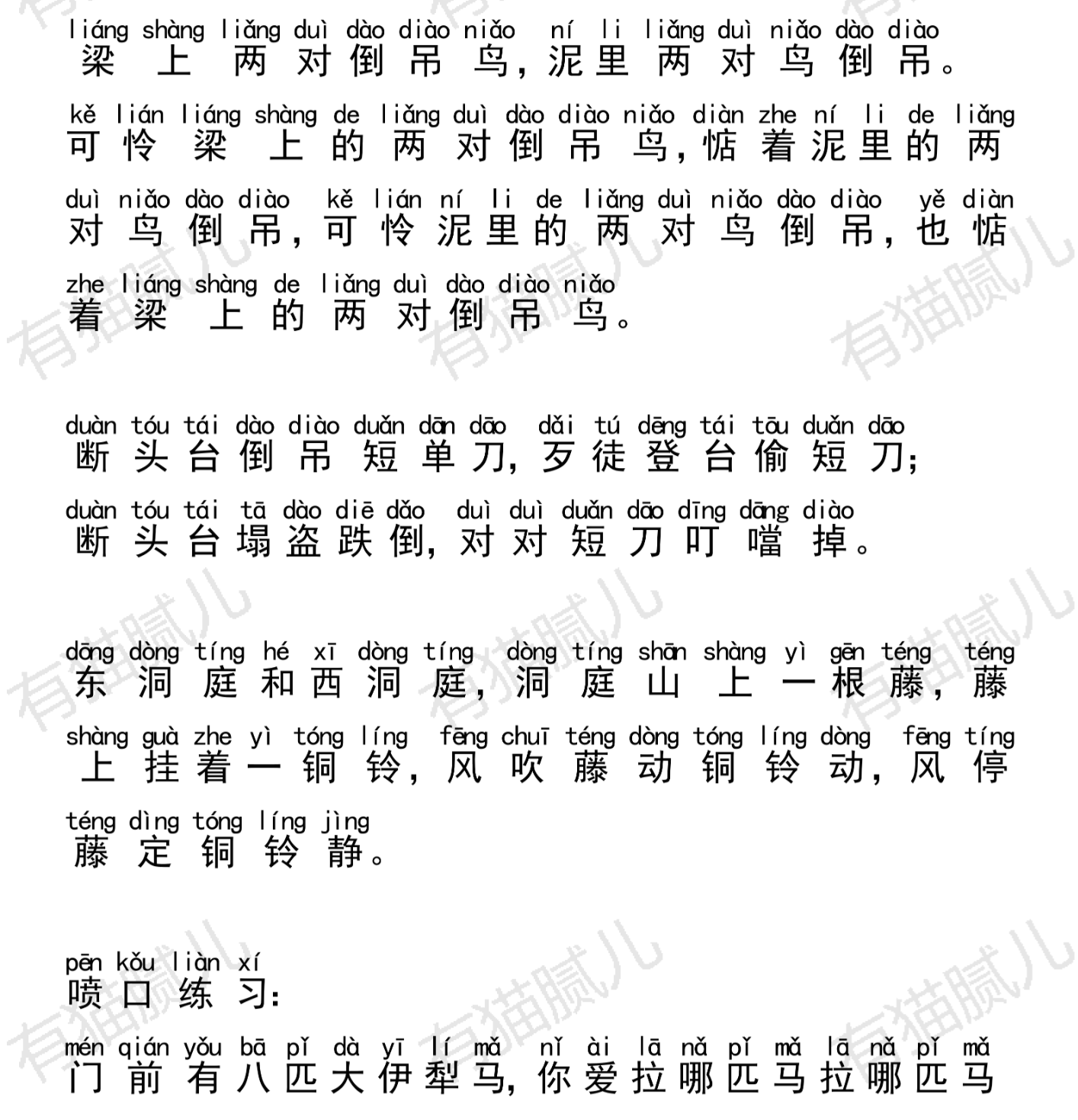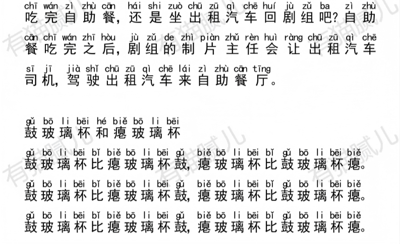 哪个绕口令你读的不好,总是读不好,就多读这一个,不许跳过。练习时,面部表情要尽可能的夸张,把嘴部动作做到最大。