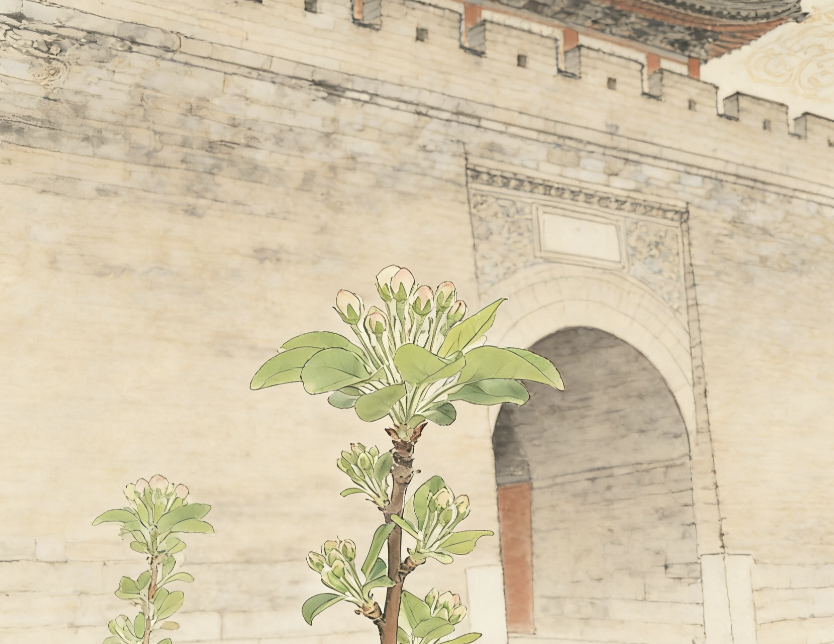郊外林中,一丛丛的花枝随风摇曳。城门边被风沙裹挟着的树木隐隐透着微光。
