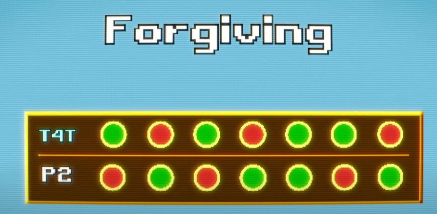 The second important quality was being forgiving. A forgiving strategy is one that can retaliate but doesn't hold a grudge. So Tit for Tat is a forgiving strategy. It retaliates when its opponent defects but doesn't let affections from before the last round influence its current decisions.