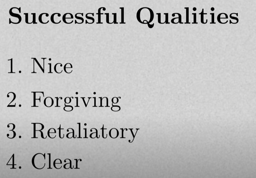 It was the simplest strategy that did the best. So I analyzed how that happened. Axelrod found that all the best-performing strategies, including Tit for Tat, shared four qualities. First, they were all nice, which just means they are not the first to defect. So Tit for Tat is a nice strategy; it can defect but only in retaliation. The opposite of nice is nasty. That's a strategy that defects first. So Joss is nasty.