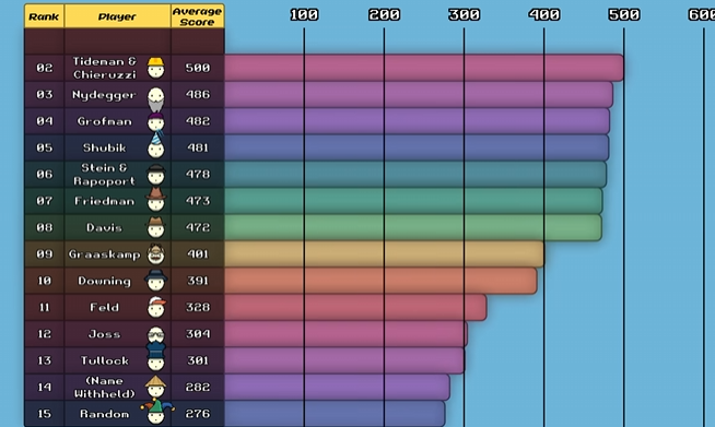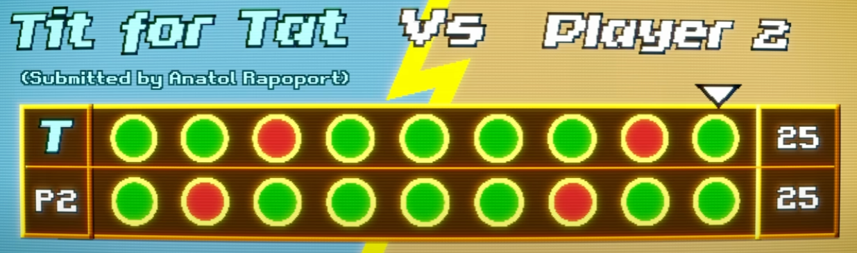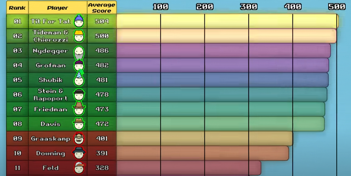 The most elaborate strategy was Name Withheld with 77 lines of code. After all the games were played, the results were tallied up and the leaderboard established. The crazy thing was that the simplest program ended up winning, a program that came to be called Tit for Tat.