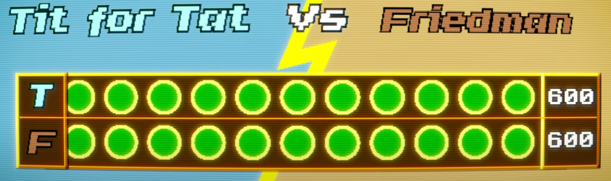When Tit for Tat played against Friedman, both started by cooperating and they kept cooperating, both ending up with perfect scores for complete cooperation.