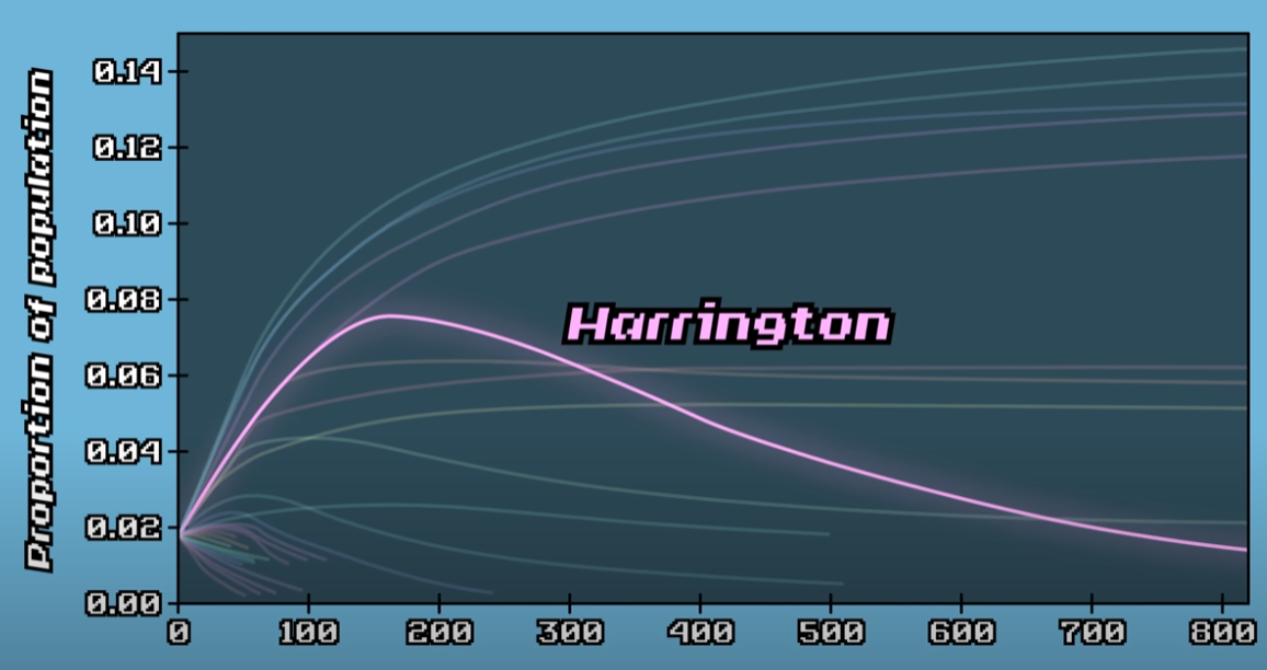 In this simulation, the worst-performing strategies quickly shrank and went extinct, while the top-performing strategies became more common. Harrington, the only nasty strategy in the top 15, first grew quickly, but as the strategies it preyed on disappeared, Harrington's numbers also dropped. This simulation tested how well a strategy performed against other successful strategies. After a thousand generations, the proportions stabilized, and only nice strategies survived. Again, Tit for Tat came out on top, representing 14.5% of the total population. This process resembles evolution, though with a subtle difference—there were no mutations, making it more of an ecological simulation.
