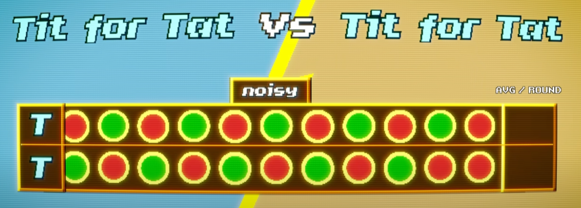 When Tit for Tat plays against itself in a noisy environment, both strategies start by cooperating. However, if a single cooperation is mistakenly perceived as a defection, the other Tit for Tat retaliates, setting off a chain of alternating retaliations. If further cooperation is misinterpreted as defection, the game devolves into constant mutual defection. Over time, both players earn only a third of the points they would in a perfect environment. This shows that while Tit for Tat initially performs well, it can fail under noisy conditions. To fix this, a reliable way to break these retaliation loops is needed.