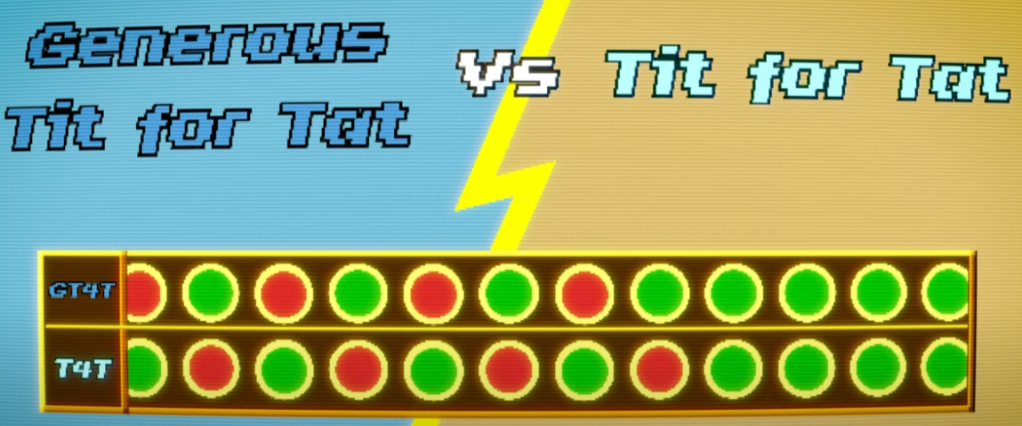 One effective solution is adding a small degree of forgiveness. Instead of retaliating after every defection, a modified Tit for Tat retaliates only about nine out of ten times. This prevents endless retaliation while maintaining enough deterrence to avoid exploitation. In experiments where noise and generosity were introduced, this slightly more forgiving approach performed significantly better. Tit for Tat is effective, but it can never outperform its opponent—it can only draw or lose. Despite this, when all interactions are tallied, it often emerges as the top strategy.