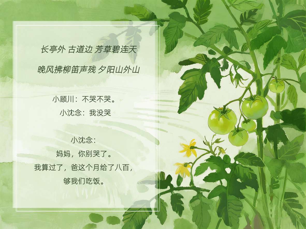 沈念:(坐在小马扎上发呆,桌上放着饭盒)