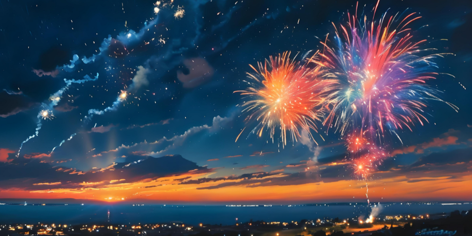 (只见漫天红色,黄色,绿色的烟花挂满了天空,圆形的火焰在月亮下面一圈圈扩散开来)